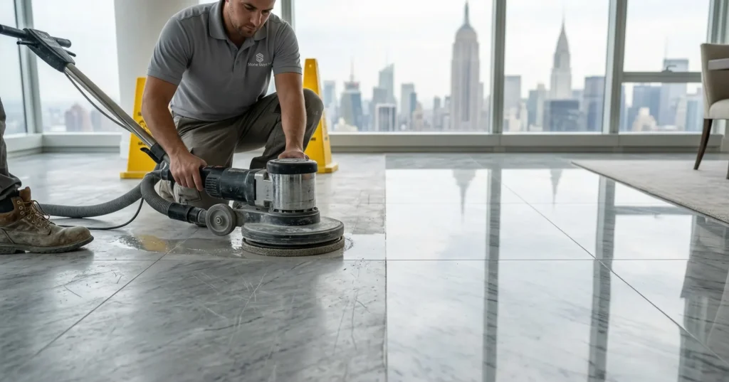 Stone Guys NY provides both marble floor polishing and full marble restoration services across Manhattan, Brooklyn, Queens, and the greater NYC metro area. Our team assesses each floor individually and recommends only what the surface actually needs, whether that is a routine polish or a complete restoration process.